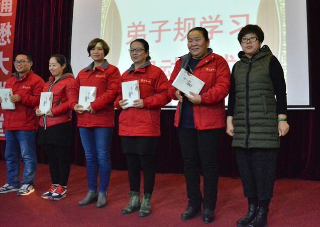 最后,舉行贈(zèng)書儀式,由蘇愛英女士向全體通懋家人贈(zèng)與由蔡禮旭老師編寫的《弟子規(guī)四十講》。
